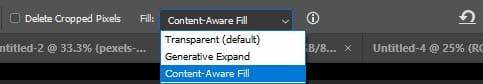 There are three options with the expand feature of the Crop Tool Content-Aware feature.